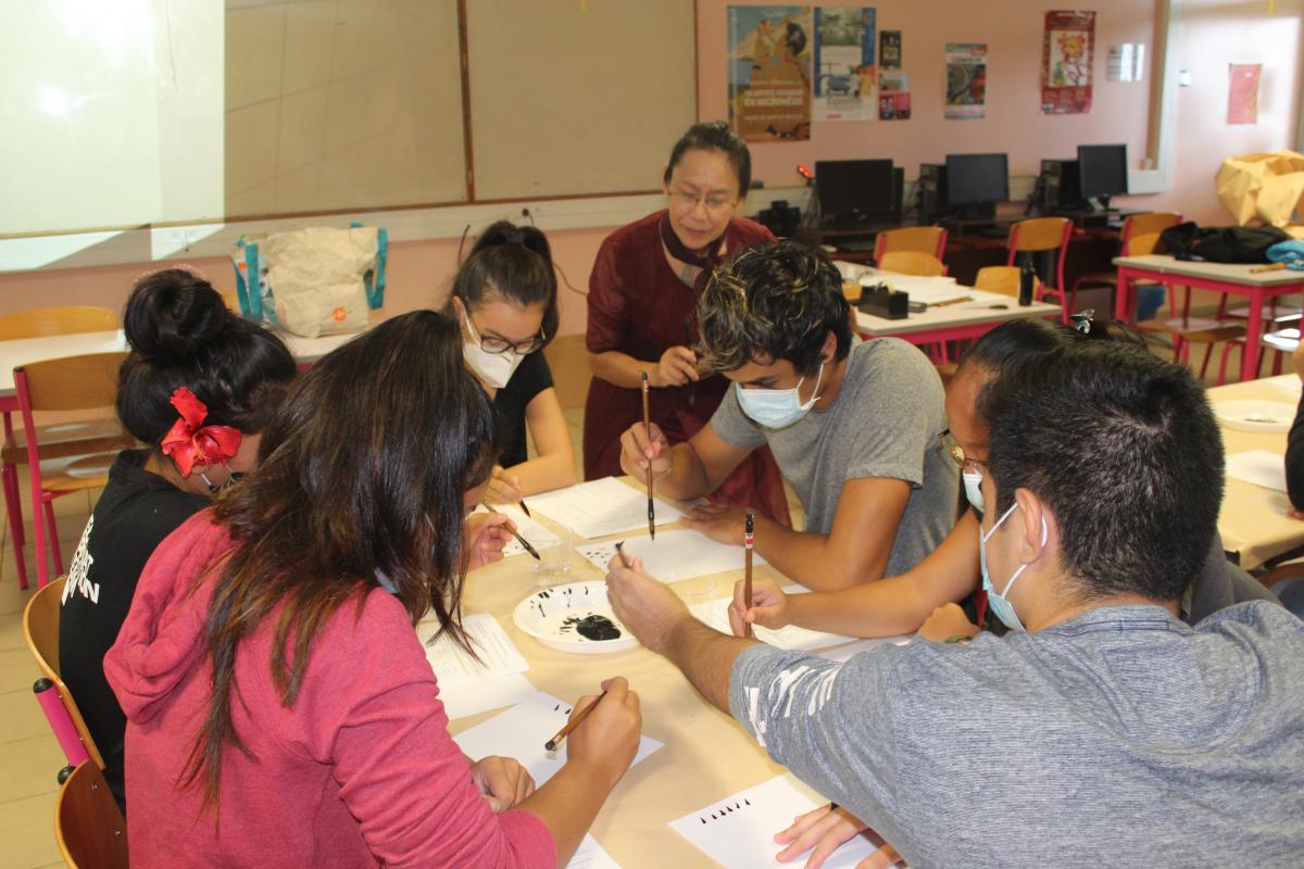 Tout un programme pour cette occasion, avec des ateliers de calligraphie qui ont pris place le matin au CDI du lycée tout au long de la semaine. Les élèves (de mandarin principalement, mais pas que), ont pu s’initier à cet art très rigoureux grâce aux enseignements de Mme Chene venue faire part de son savoir et ses compétences.